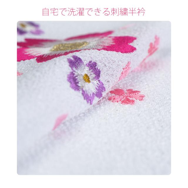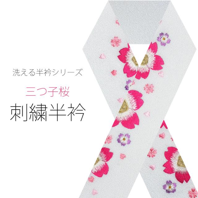 刺繍半衿 振袖 オシャレ着 洗える半衿 洗濯可 日本製 【メール便送料無料!】三つ子桜 白 ピンク ちりめん