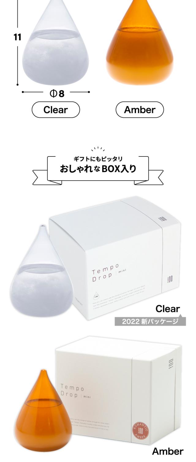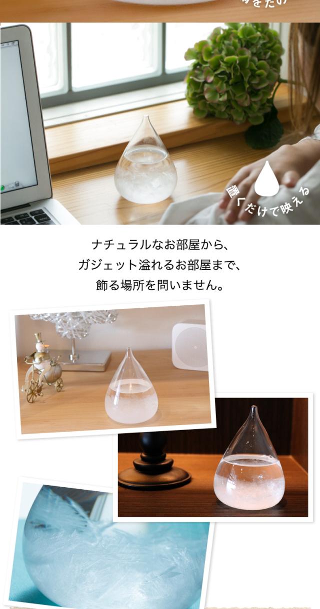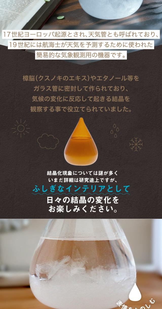 | 注意事項 | ※ご覧の環境により、色の見え方が異なる場合がございます。 ※TempoDrop miniには台座は付属しておりませんので、ご注意ください。※設置場所の環境によりますが、樟脳は経年変化で徐々にあめ色に変化します。直射日光にあてると変色が早まりますのでご了承ください。変色によって結晶化が劣化していく事はございません。 ※ストームグラスは特に気温の変化に反応します。設置する際は空調機が直接当たらない、気温の変化が起こりやすい玄関などの場所がおすすめです。 ※本品は液体が封入されたガラス製品です。レンズ効果により火災が発生する恐れがありますので直射日光の当たる場所に飾ることや保管することは絶対にお止め下さい。 ※絶対に加熱及び急冷しないで下さい。本体に急激な温度変化を与えると火災や爆発の恐れがあります。本体を直接火に掛けたり、電子レンジや冷凍庫に入れないで下さい。 ※熟練した技を持つ職人によって一つ一つ手作りされているため、形・サイズ・重量に若干のバラつきがあったり、製法上ガラスに気泡や黒点などが見られる場合がございます。 |