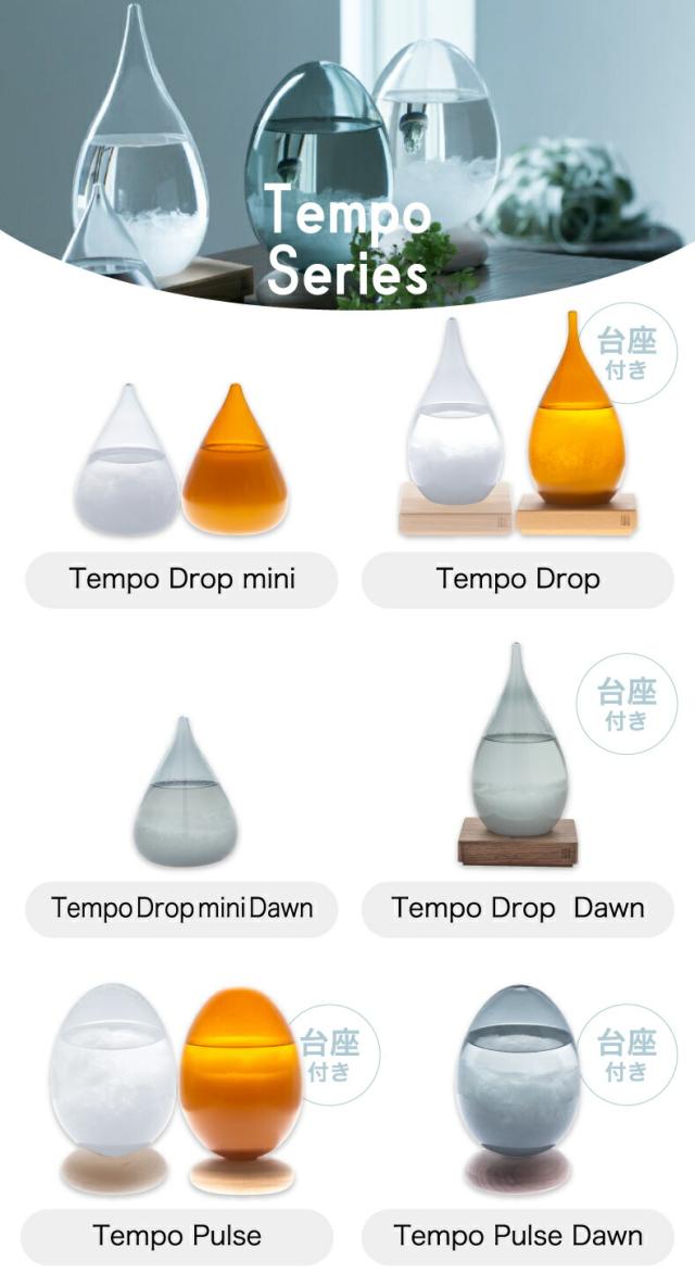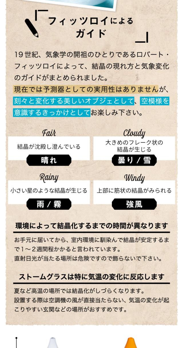 ストームグラスは19世紀に航海士等が使用していた天候予測器です。樟脳(クスノキのエキス)やエタノール等をガラス管に密封して作られており気候の変化に反応して起きる結晶を観察する事で、役立てられていました。ジュール・ヴェルヌの小説『海底二万マイル』に出てくるノーチラス号の中にも設置されています。その後の科学の発展に伴い、実際には結晶化現象については謎が多い事がわかり、いまだ詳細は研究途上です。現代では予測器としての実用は難しいですが、季節によって景色が変わるように、日々変化する結晶の様子を『Tempo Drop』でお楽しみください。
