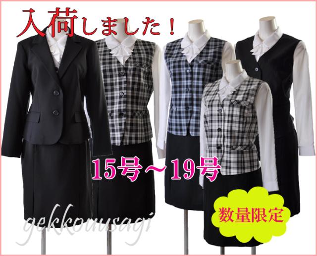 15号〜19号サイズのジャケット・ベスト・スカートの3点スーツです。