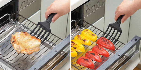 魚焼きグリルのアミにスッと入って、食材を崩すことなくすくえるグリルスクーパーです。菜箸にはないバツグンの安定感で、簡単にすくえます。