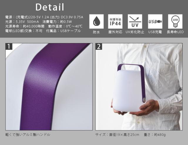 フランス発老舗アウトドア家具ブランドFermob/フェルモブから、ガーデンやキャンプなど屋外でも気軽に使える、ポータブルLED照明のご案内です。こちらのライト、UV劣化や軽い衝撃に対して強く、さらに防水性能が求められる環境で使用できる、保護等級IP44を取得していて、タフなアウトドアシーンでも気兼ねなく使えます。ガーデンでのディナーや、ベランダのグリーンのアクセントなど屋外のインテリアとして最適です。キャンプやグランピングなどのレジャーでも大活躍してくれます。7時間点灯する長持ちバッテリーは、備え付けのUSBコードで充電できます※。電源コードや電池の必要がなく、とても軽量なので、スマートに屋外へ持っていけます。ライトの明るさは(OFF/50%/100%)と3段階、スイッチを押すごとに切り替わります。電球はエコでお財布にも優しい長寿命LED採用。デザインはFermob/フェルモブらしいシンプルでポップな印象でとてもおしゃれ!屋外はもちろんですが、玄関やお部屋のインテリアライトとしても◎玄関先の足元や、室内のちょっとした暗がりを照らす、間接照明としても活躍してくれます。実用性とデザイン性、使いやすさを兼ね備えた、フェルモブを象徴するような素晴らしいプロダクトです。※コンセントで充電するには別売りのACアダプタが必要です。