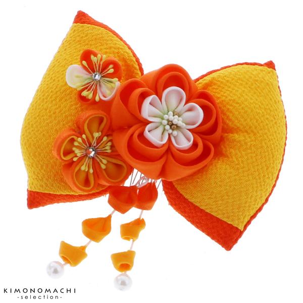 【カラー】鮮やかな黄色×濃いオレンジ色のふっくらとしたリボン。濃いオレンジ色、山吹色などの色使いのつまみのお花。濃いオレンジ色、山吹色の下がり飾り。