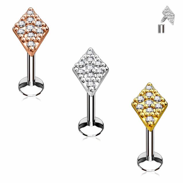 ひし形を模ったシルバー、イエローゴールド、ピンクゴールドのモチーフにキラキラのクリスタルのジルコニアをセットした高級感のあるラブレット型ボディピアス。デザイン部分にネジ山があり、シャフトにネジ穴がある逆ネジタイプのインターナル型ボディピアスは、皮膚の内側を傷つけにくいという理由からファーストピアスやセカンドピアスとしても使われるボディピアスです。シャフトの素材も安心のサージカルステンレス316L。メンズでもレディースでも使えるのでプレゼントやペアルックにもおすすめ。軟骨ピアスのヘリックスやトラガス、アンテナヘリ、口ピアスのリップやラブレットにも最適です。片側が平らなフラット型ボディーピアス。【スペック】