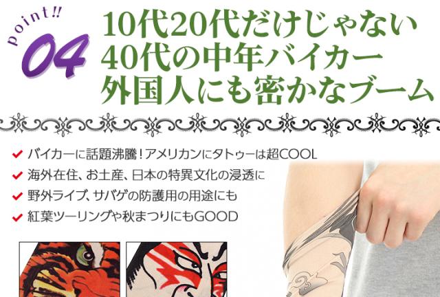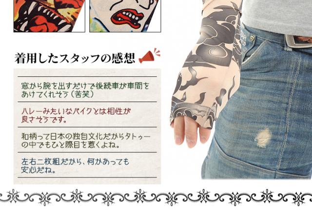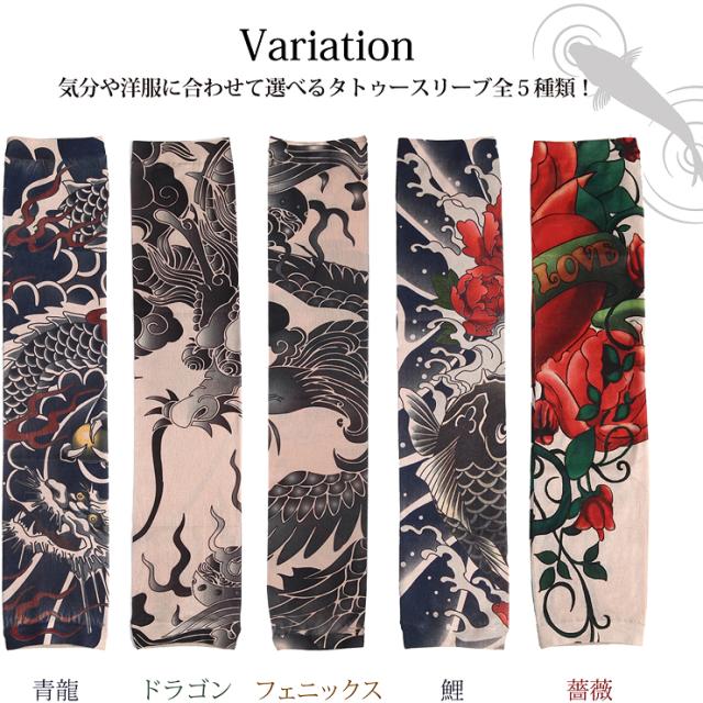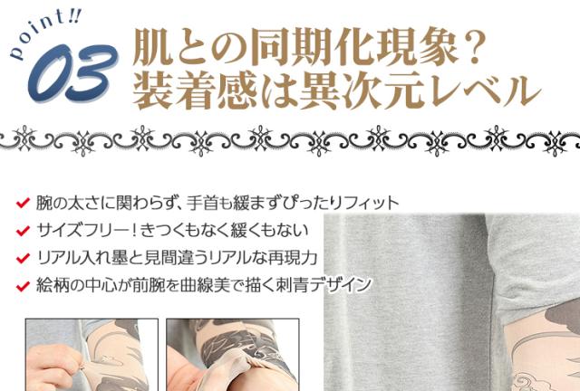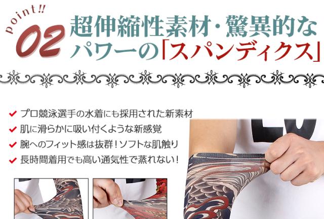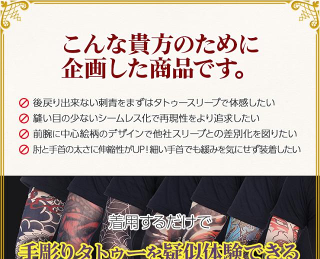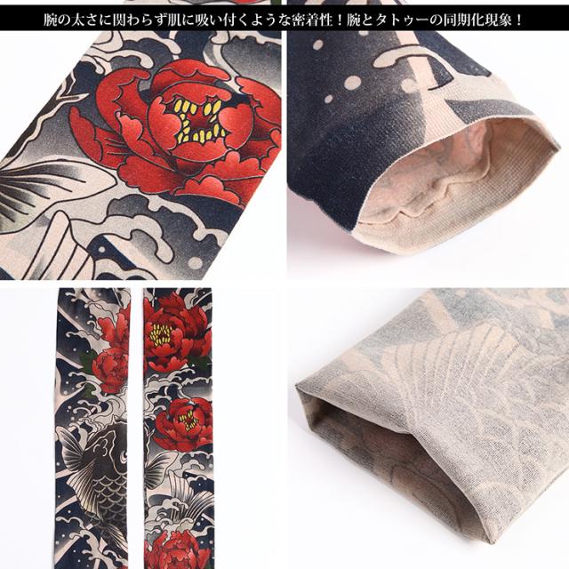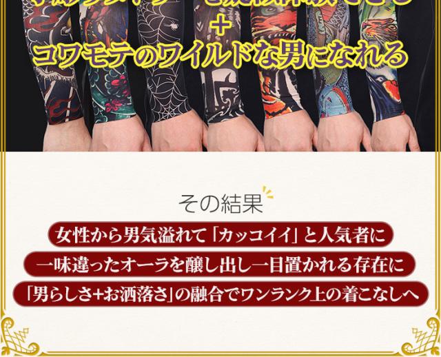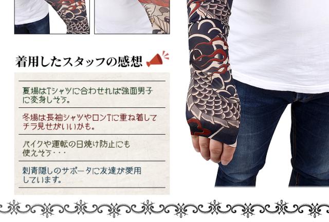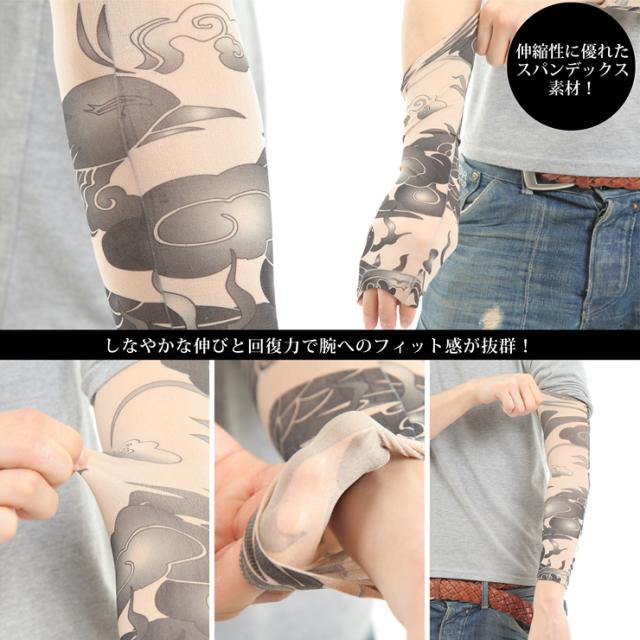 身体に手彫りする本物のタトゥー(刺青)は、費用面や身体への影響が懸念されます。肝炎などの身体に与える悪影響、数十万という費用の捻出は金銭面でも大きな負担です。和彫りを身体に入れたい方は、このタトゥースリーブを装着してまずはイメージを掴んでください。夏場のTシャツと合わせてファッショナブルにお洒落を楽しみたい方は、男気溢れた強面イケメンに変身出来ます。冬場はロンTの下に装着し、腕まくりをしてチラッと見せるオシャレさがカッコイイ!女性心を掴むアイテムとしても重宝出来ます。洋服やアクセサリーをセレクトするような感覚で刺青腕カバーも選んでみるとオシャレの幅がグッーと広がります。雑誌やTVで人気の海外俳優などと同様なお洒落を満喫したい方には、必見です!手首の時計、首元のアクセサリー、前腕筋の筋肉がファッションセンスや男らしさを感じるとの統計があります。タトゥーカバーは前腕筋のオシャレ度を最大限に高める作用があるのです!素材は、伸縮性、しなやかさ、回復力を兼ね揃えた高機能素材であるスパンデックスを採用!是非、オススメです!