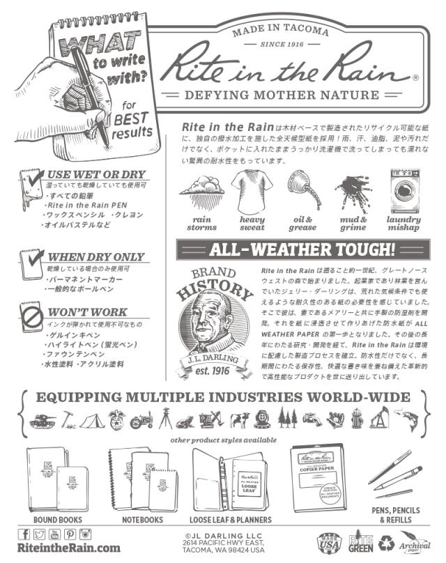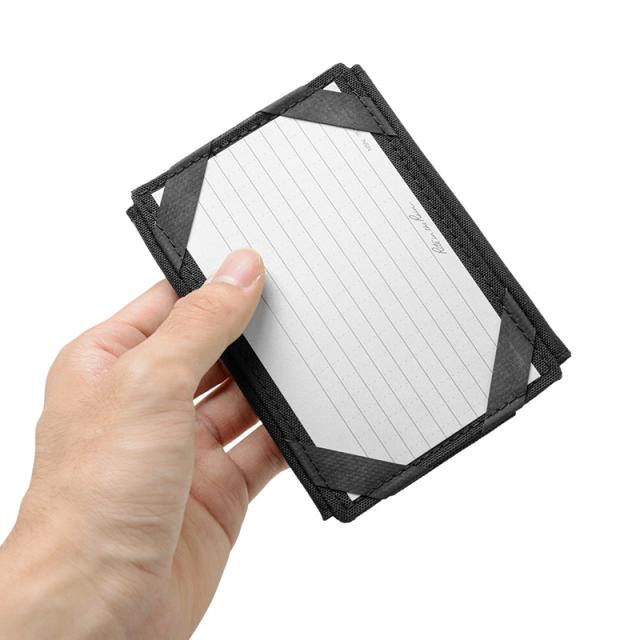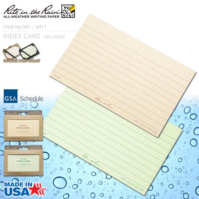 木材ベースで製造されたリサイクル可能な紙に、独自の撥水加工を施した全天候型紙を採用した防水・タクティカル仕様のインデックスカード。雨、汗、油脂、泥や汚れだけでなく、洗濯機で洗ってしまっても濡れない驚異の耐水性をもっています。カード枚数:100枚。