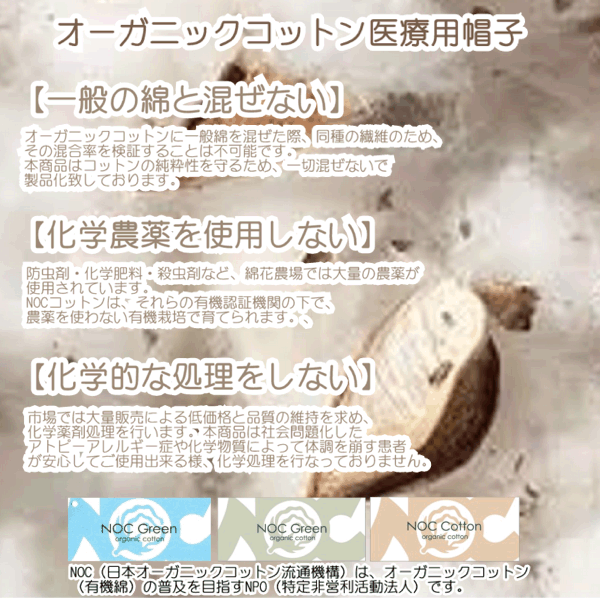 室内でもお出掛け用にも最適な医療用帽子 帽子の素材はオーガニックコットン100%のため肌触りも柔らかく被り心地も快適。