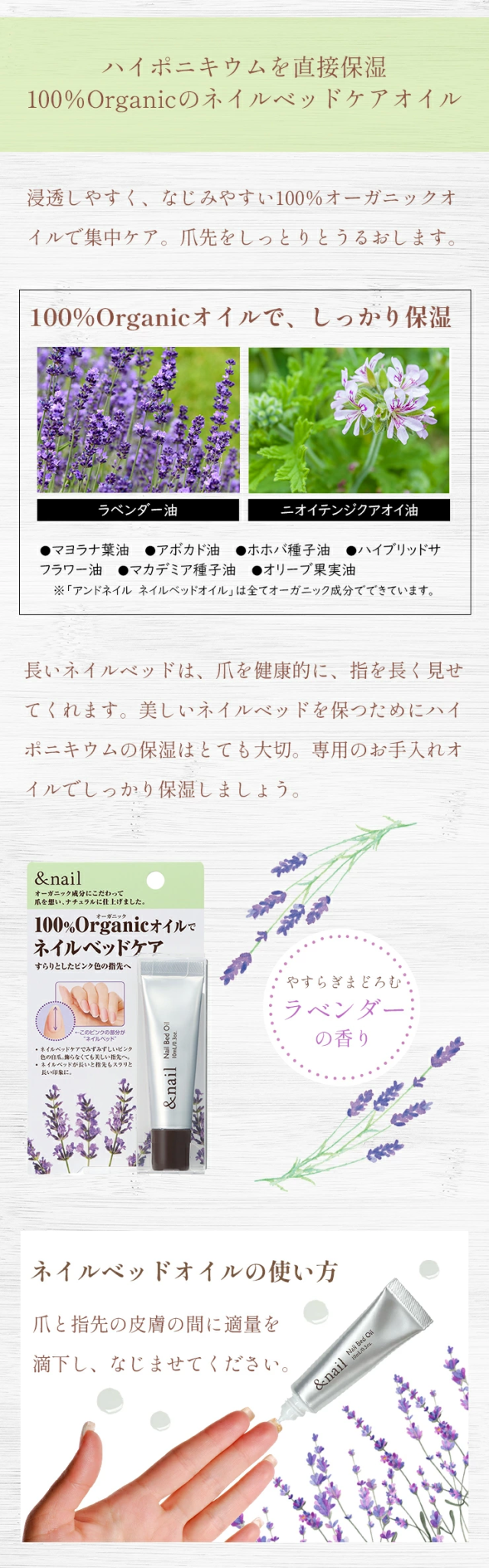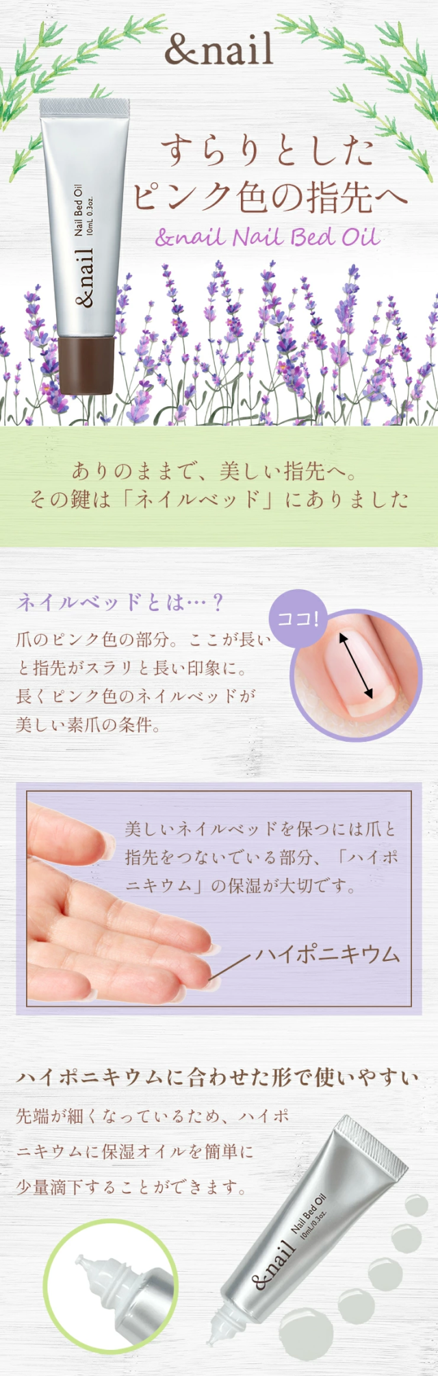 ネイルベッドケアでスラリと見える美しい指先へ。長いネイルベッドは、爪を健康的に、指を長く見せます。美しいネイルベッドを保つために、ハイポニキウムを直接保湿するオイル。ありのままでも、長く美しいピンク爪。ラベンダーの香り。 |