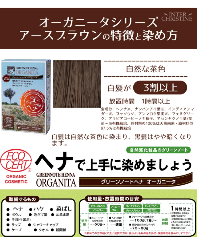 アースブラウンの使用量のめやす:根元・部分染め70g〜、ショート全体100g〜。放置時間は1時間以上。※初めての方や硬くて太い髪質の方は、表示よりも粉の量を多め・放置時間を長めにしてください。 |