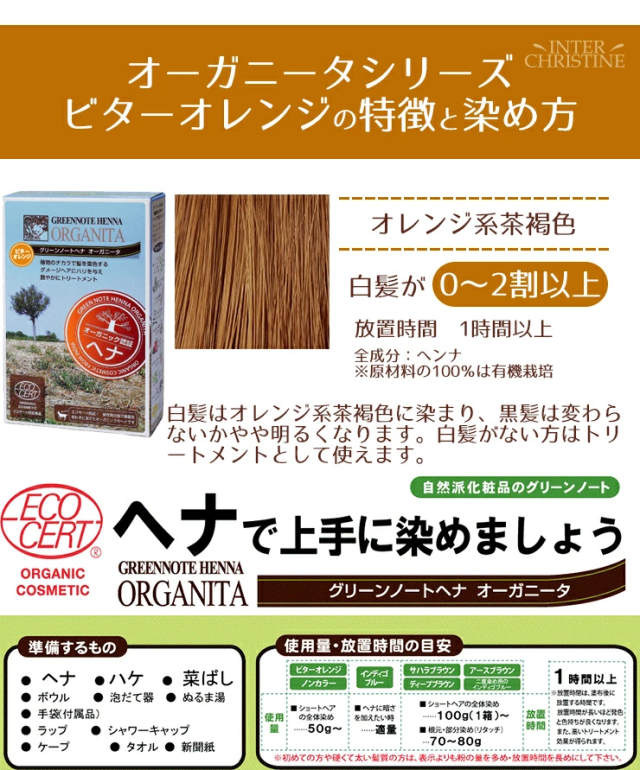 ビターオレンジの使用量のめやす:根元・部分染め30g〜、ショート全体50g〜。放置時間は1〜2時間以上。半日前に溶いておくと30〜40分で染まります。※初めての方や硬くて太い髪質の方は、表示よりも粉の量を多め・放置時間を長めにしてください。 |