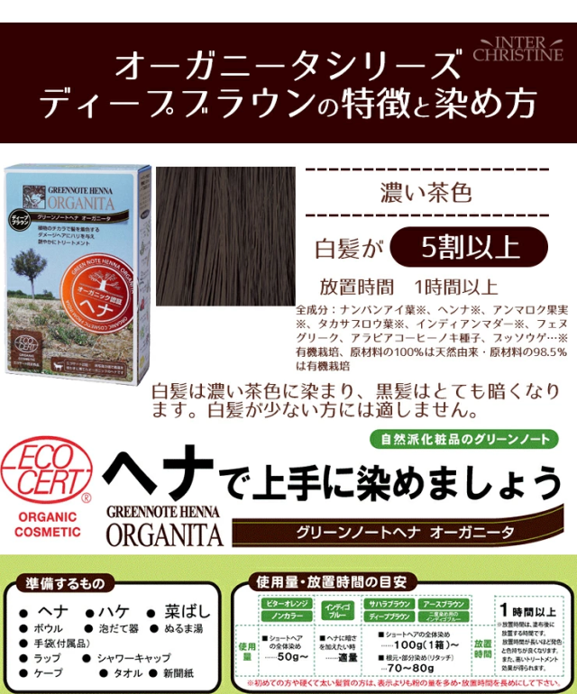 ディープブラウンの使用量のめやす:根元・部分染め70g〜、ショート全体100g〜。放置時間は1時間以上。※初めての方や硬くて太い髪質の方は、表示よりも粉の量を多め・放置時間を長めにしてください。 |