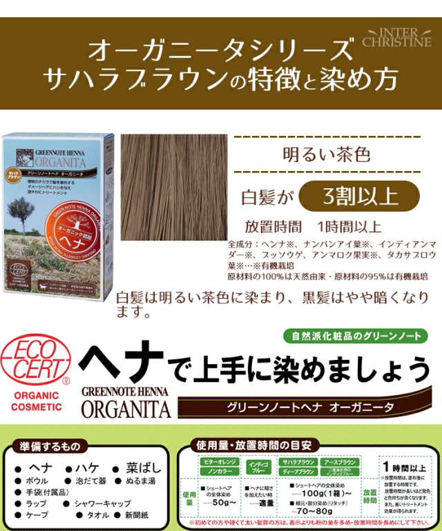 サハラブラウンの使用量のめやす:根元・部分染め70g〜、ショート全体100g〜。放置時間は1時間以上。※初めての方や硬くて太い髪質の方は、表示よりも粉の量を多め・放置時間を長めにしてください。 |