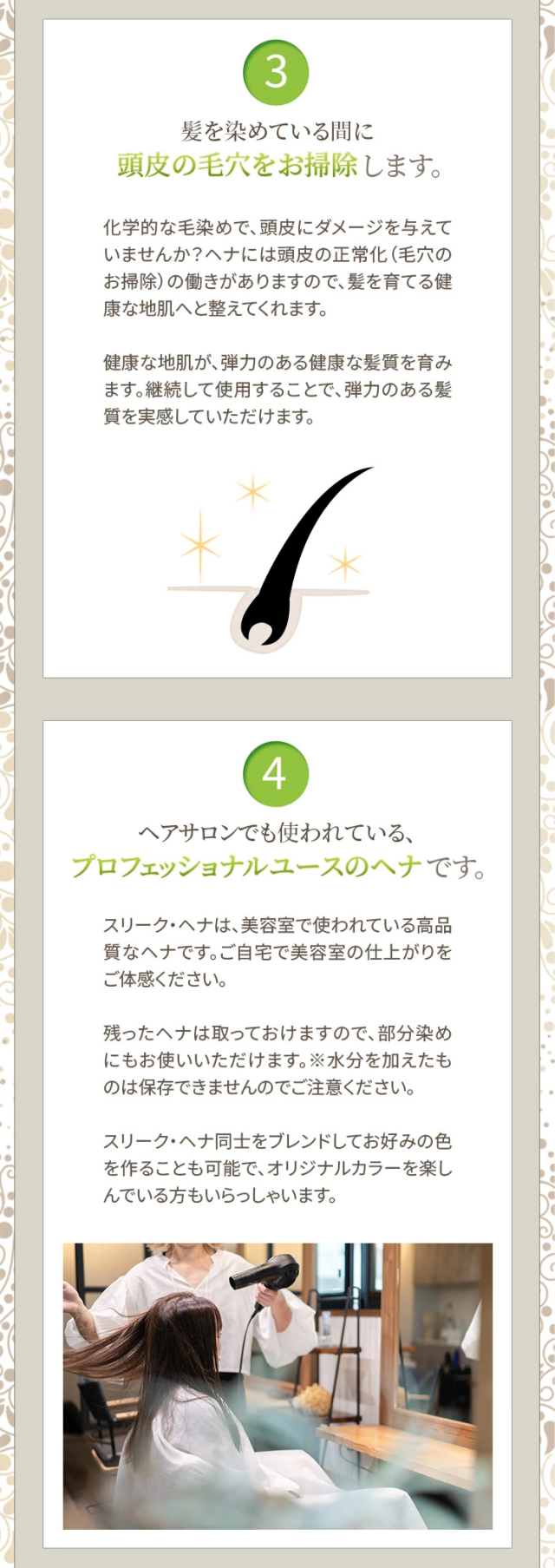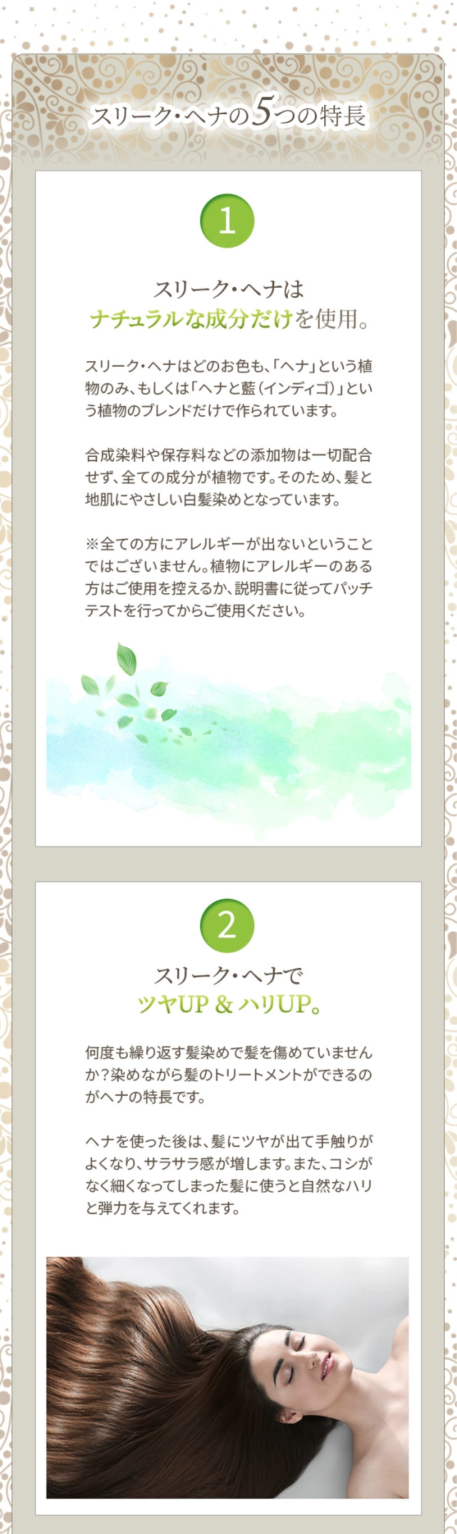 「スリークヘナ」は、「マヘンディヘナシャンプー」の姉妹品。「ヘナ」というハーブの一種で白髪を染める、天然100%、ナチュラルな白髪染めです。インド産のヘナは、栽培地を限定して生産管理をし、輸入後に日本国内で品質管理を実施しています。化学合成染料や化学物質は一切配合していません。Sleek Henna |