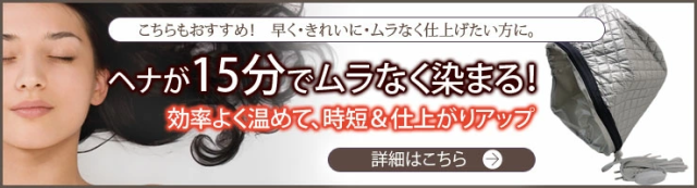 シャンプー後にヘナを微温湯で溶かし、髪に塗布します。その後ラップで頭を包み、40〜60分放置します。加熱しながらの放置なら30〜40分置きます。時間が経過したらラップを取り10分クーリング、最後にシャンプーします。 |