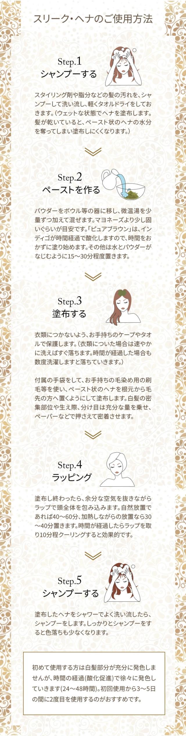 シャンプー後にヘナを微温湯で溶かし、髪に塗布します。その後ラップで頭を包み、40〜60分放置します。加熱しながらの放置なら30〜40分置きます。時間が経過したらラップを取り10分クーリング、最後にシャンプーします。 |