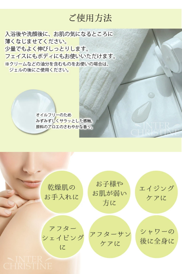 フェイスとボディにお使いいただけます。シャワーや洗顔後、お肌の気になるところに薄くなじませてください。少量でよく伸びしっとりします。油分を含んだクリームなどをお使いの場合は、ジェルの後にお使いください。 |