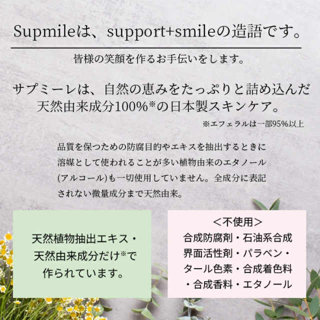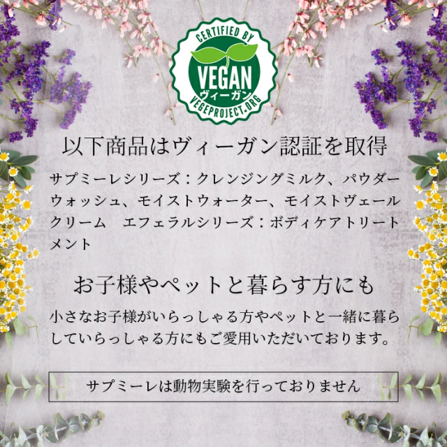 サプミーレ クレンジングミルク 120ml ×2本セット ※メイン原料の山茶花油(ユチャ)が米ぬか油へ変更となりました。ミルクの優しさをそのままに、クレンジング力向上や敏感肌への優しさ、エイジングケアも意識した製品となりました。 コメヌカ油をメインとした贅沢なクレンジングミルク。 ゴヨウマツ種子油やアルガンオイルが肌の潤いを守りながらメイクと毛穴の汚れを落とします。 乾燥が気になる肌をしっとりと洗い上げるエモリエント+保湿成分が98%の贅沢なクレンジングです。 植物由来成分のみなので、スネやかかと・ひじ等のボディクリームとしても使える優れものです。 <サプミーレのこだわり> サプミーレは天然素材成分だけで作られた化粧品です。創業60年の化粧品製造会社が、ほんとうにお肌にやさしい化粧品を目指し、原料からこだわって自社のブランドとして開発しました。お肌が弱くてお化粧品がしみてお困りの方、乾燥にお悩みの方、肌の弱いお子さま、男性にもお使いいただけます。ペットがなめても安全ですので、ペットと暮らしている方にもおすすめです。(すべての方の肌に合うことを保証するものではございません)※サプミーレは全製品「動物実験」を行っておりません。 1.天然植物抽出エキス・天然由来成分だけで作られました 原料を抽出する際に使用するキャリーオーバー成分も植物由来の完全無添加。合成保存料、石油系合成界面活性剤、パラベン、タール色素、合成着色料、エタノールは使用していません。 2.合成化学物質・合成防腐剤・香料・着色料・アルコールは使用していません 原料の保存等に使われるアルコールなども一切排除された原料を厳選して使用しています。 3.食品と同じように使用期限があります 使用期限は、容器底・化粧箱に印字されています。 <使用期限について> 使用期限が明記されています。未開封で製造から2年、開封後は3ヶ月以内にお使いください。 【お試し】サプミーレ スキンケアセット はこちら |