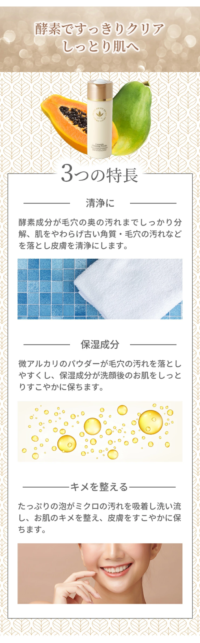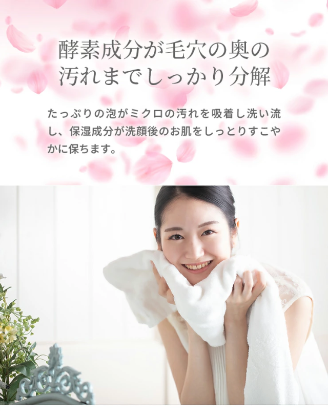 酵素成分が肌をやわらげ古い角質・毛穴の汚れなどを落とし皮膚を清浄にします。肌のキメを整え、すこやかに保ちます。 |
