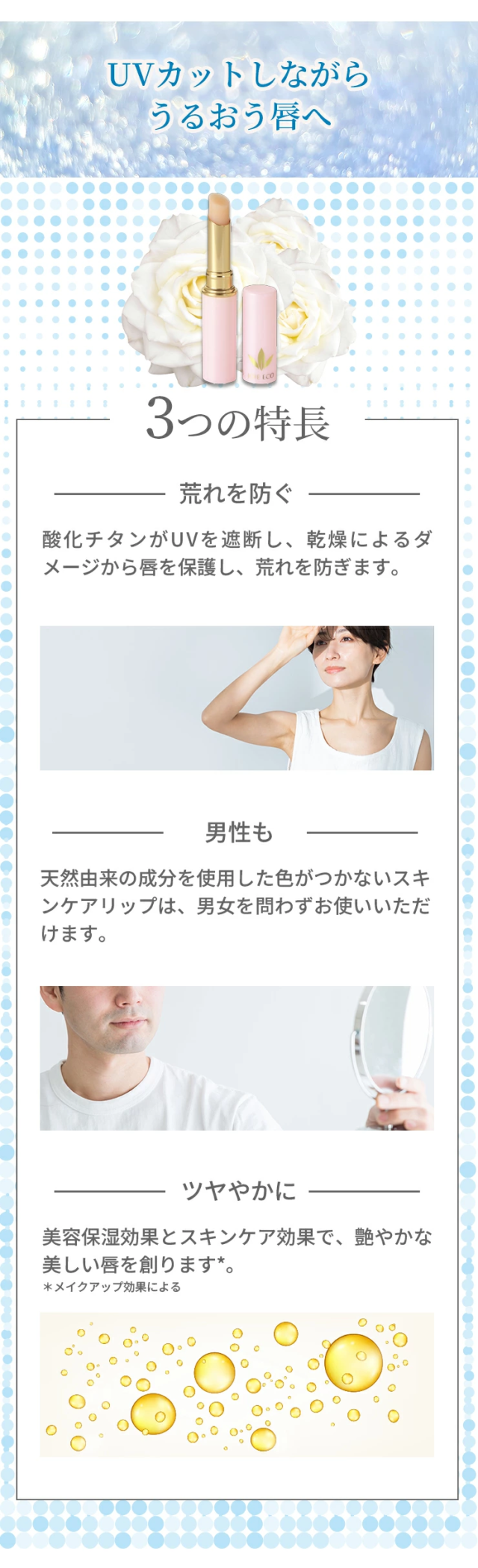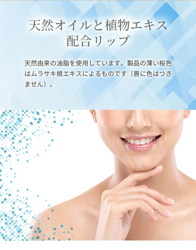 乾燥によるダメージから唇を保護し、荒れを防ぎます。天然由来の成分を使用した色がつかないスキンケアリップは、男女を問わずお使いいただけます。美容保湿効果とスキンケア効果で、艶やかな美しい唇を創ります*。 |