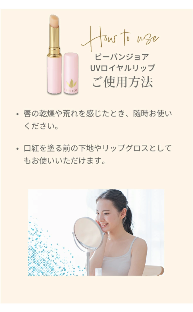 唇の乾燥や荒れを感じたとき、随時お使いください。口紅を塗る前の下地やリップグロスとしてもお使いいただけます。 |
