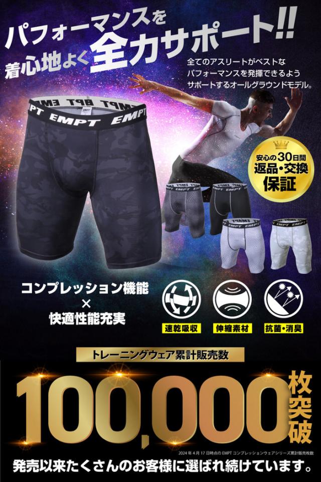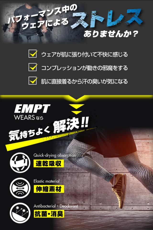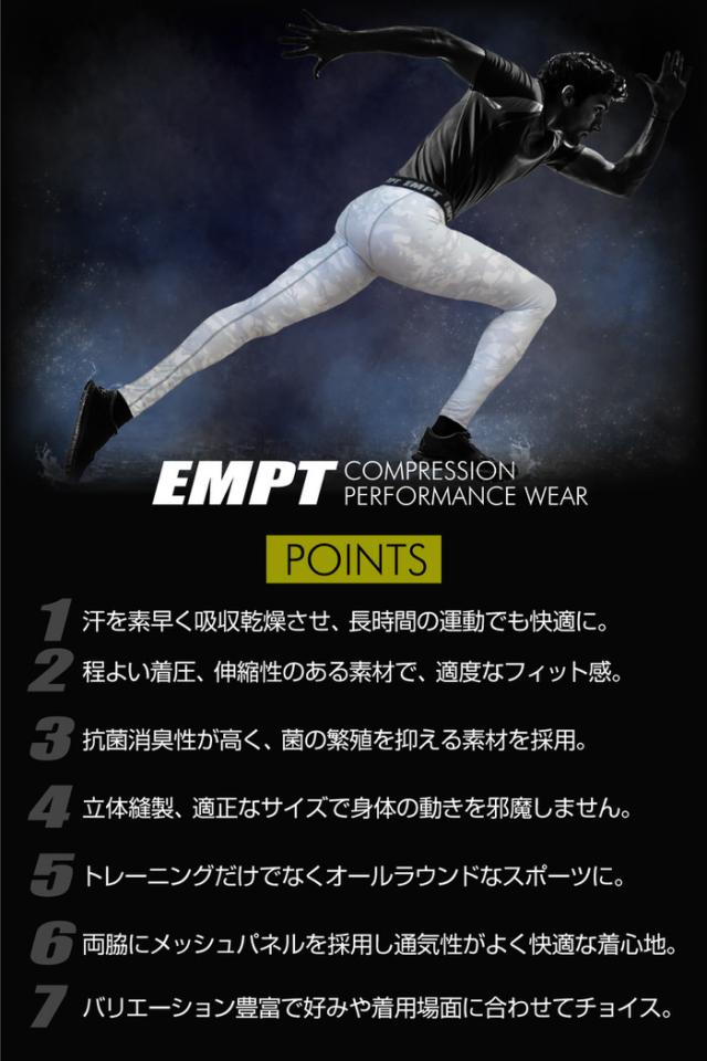 ■商品説明:EMPTからスポーツシーンにマッチするコンプレッションウェアが登場! ストレッチ素材で快適なフィット感、適度な着圧で、あらゆるスポーツのパフォーマンスをサポート!