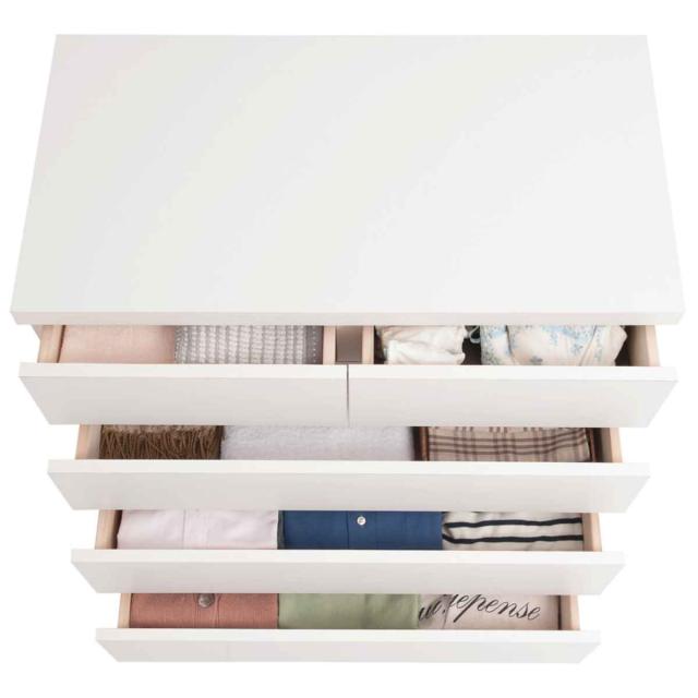 4段の引出しでたっぷり収納が可能。小引出しには下着類やタオル等を整理整頓できます。シャツ類ならキレイにこれだけ収納できます。他にもズボンなども収納できて便利です。大容量ですので、ご家族分の衣類収納にもおすすめです。