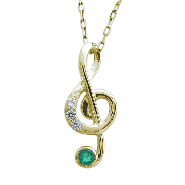 5月誕生石エメラルドを一粒使用した、18金製のト音記号(音符)モチーフネックレスペンダントです。