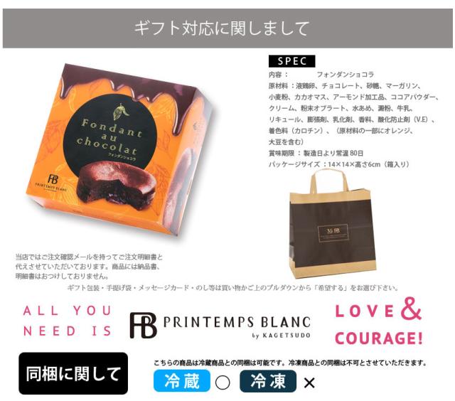 | 濃厚なチョコレートケーキの中に、クーベルチュールチョコを使って作ったガナッシュを入れて焼き上げました。 お召し上がりの前に、電子レンジで30秒〜1分あたためると、中のチョコレートがとろけて、デザート感覚でお召し上がりいただけます。パッケージサイズ :14×14×高さ6cm(箱入り) |