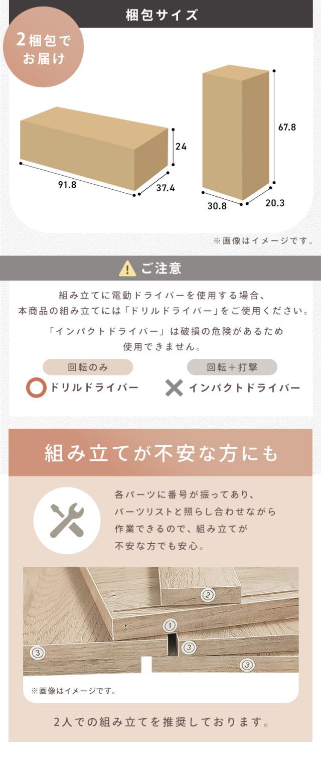 - 商品が時差で2回に分けて届きました。 1人で組立てましたが、組立てる順番が分かりづらい上に重かったです。 特に、下の方の金具の取り付け方が難関でした。 付属のボンドの量が足らず、手持ちの木工用ボンドを...