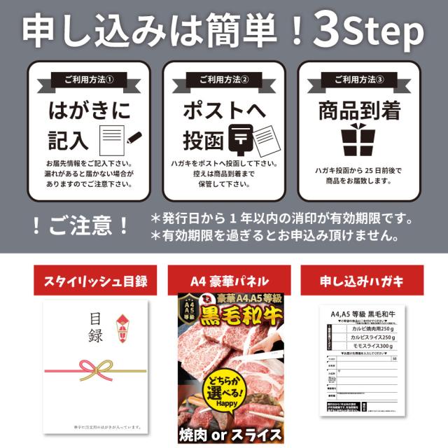 【A4 パネル 目録付 国産黒毛和牛を直送でお届け! 選べるカルビ焼肉 カルビスライス ももスライス!2次会 景品 目録 お肉 ゴルフコンペ 賞品 歓迎会 送別会イベント用品 忘年会 新年会 誕生会 】