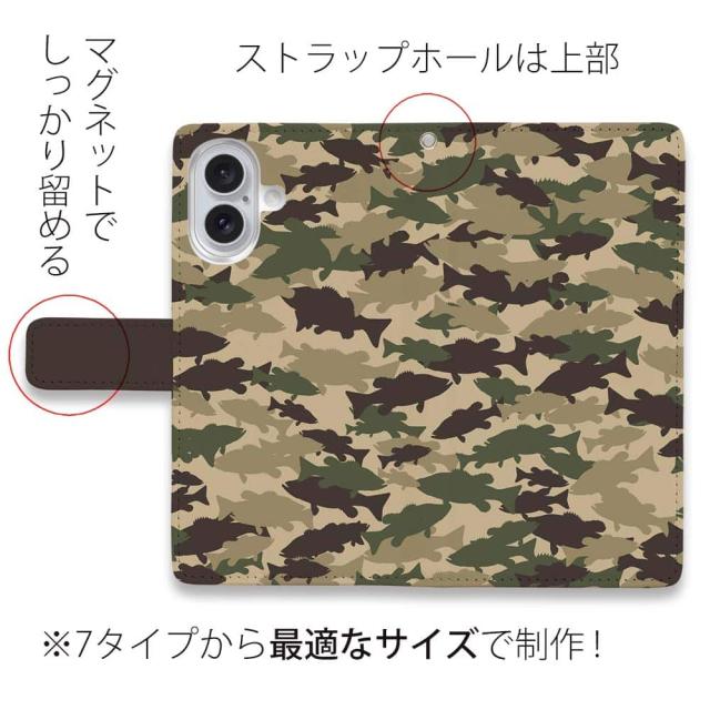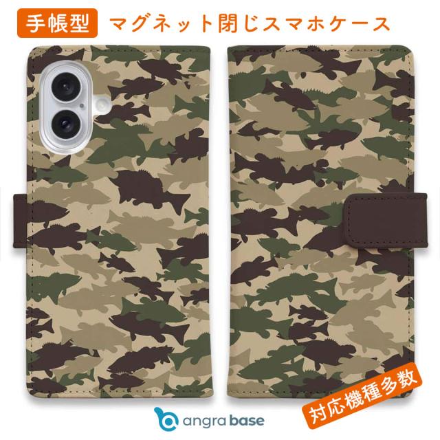 スマホケース 手帳型 カード収納 マグネット iPhone17 Pro Max iPhone Air iPhone16e iPhone16 Pro Max 16 Plus 15 Pro Max Xperia 10 VII Galaxy AQUOS ARROWS Pixel10 XL 釣り 魚 ルアー ブラックバス 迷彩大柄4