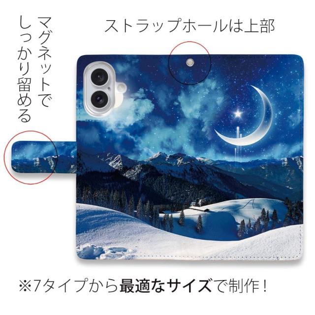 スマホケース 手帳型 カード収納 マグネット iPhone17 Pro Max iPhone Air iPhone16e iPhone16 Pro Max 16 Plus 15 Pro Max Xperia 10 VII Galaxy AQUOS ARROWS Pixel10 XL 月 星 星空 夜空 かわいい 雪山と大きな三日月