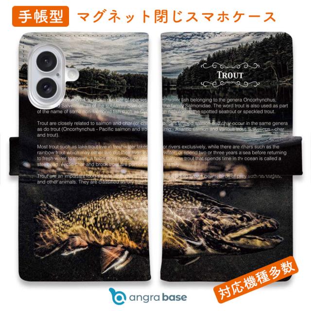 スマホケース 手帳型 カード収納 マグネット iPhone17 Pro Max iPhone Air iPhone16e iPhone16 Pro Max 16 Plus 15 Pro Max Xperia 10 VII Galaxy AQUOS ARROWS Pixel10 XL 釣り 魚 ルアー 送料無料 ブラウントラウト アメコミ風デザイン