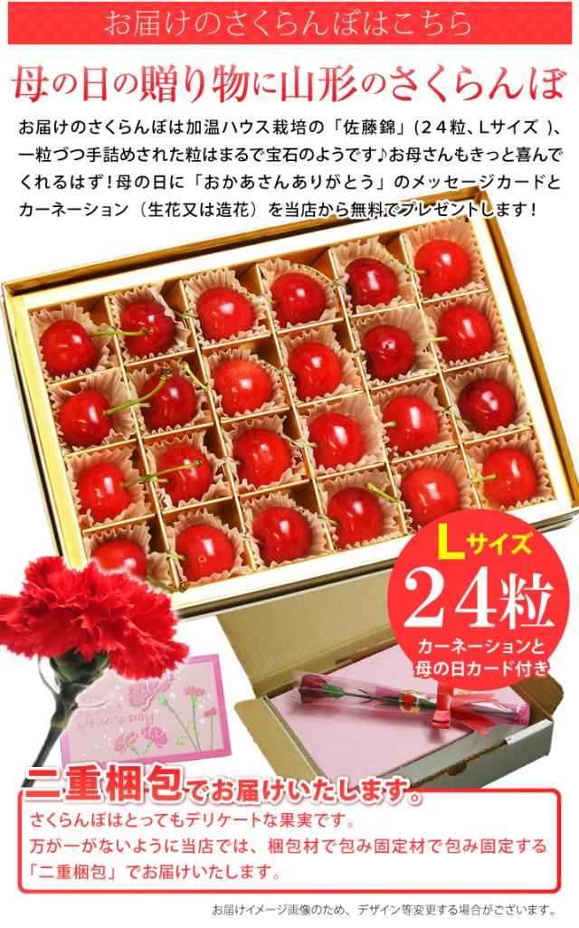 母の日ギフト 山形県 東根産 佐藤錦 24粒 秀品 L玉 カーネーション+母の日カード付 手詰め 山形 産地直送 サクランボ sakurannbo チェリー フルーツギフト 果物 美味しい おいしい 高級 贈答用 贈答 ギフト 贈り物 プレゼント 着日指定不可