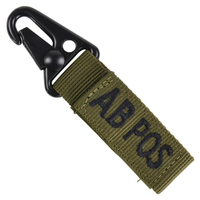 コンドル・アウトドア社の血液型別キーチェーン。刺繍された文字のPOSはPositive・・・陽性または+という意味です。 ループ部分はベルトに通し、鍵などをフック部分に取り付ける事が出来ます。