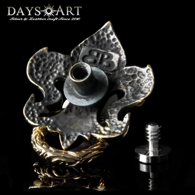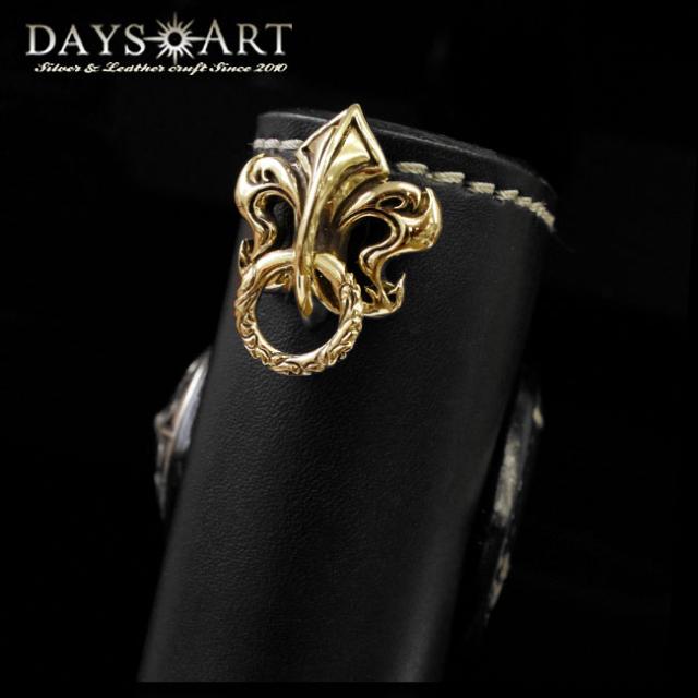 常に百合の紋章をモチーフにトライバルの彫刻が施されたシャープなデザインんが特徴のドロップハンドルです。ブラス製の黄金色がゴージャスでリング部分にもアラベスク模様がデザインされています。ウォレットチェーン用に大活躍!ドロップハンドルを付け替えるだけでレザーウォレットの印象が様変わりします。取り付けはネジ式ですのでドライバーで簡単に装着可能なカスタムコンチョ(ドロップハンドル)です。