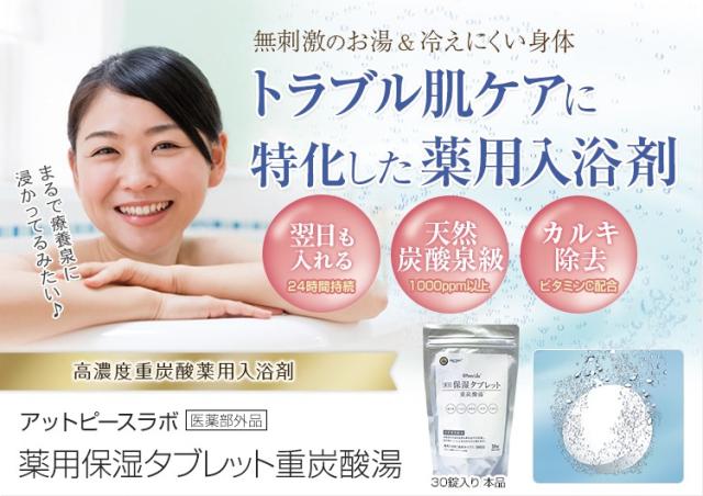 薬用保湿タブレット 重炭酸湯はトラブル肌に特化した薬用入浴剤です。重炭酸イオンがめぐりを良くしいつまでも冷えにくく、残留塩素を中和し、お肌に優しい入浴剤です。
