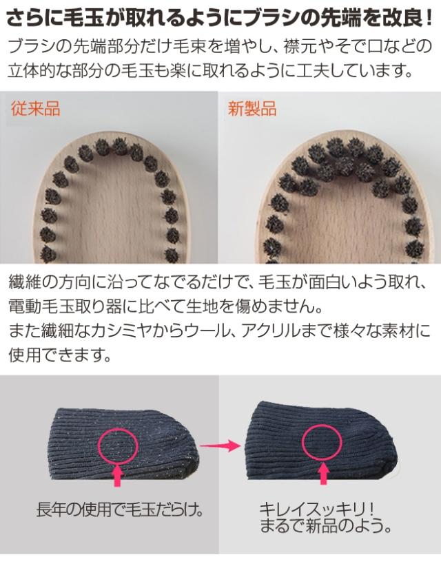 ブラシの先端部分だけ毛束を増やし、襟元や袖口、裾等の毛玉も楽に取れるように工夫しました。