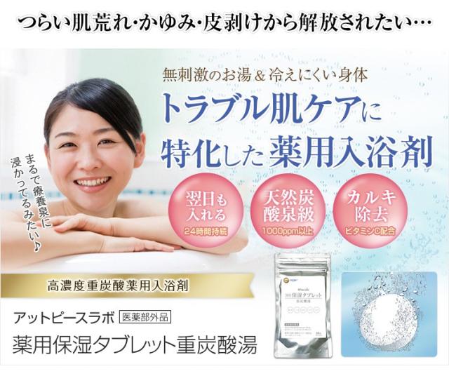 薬用保湿タブレット 重炭酸湯はトラブル肌に特化した薬用入浴剤です。重炭酸イオンがめぐりを良くしいつまでも冷えにくく、残留塩素を中和し、お肌に優しい入浴剤です。