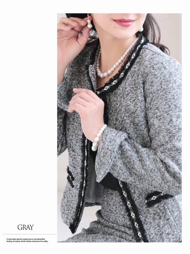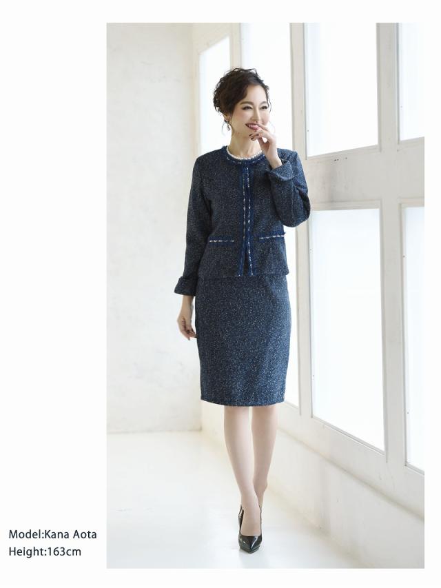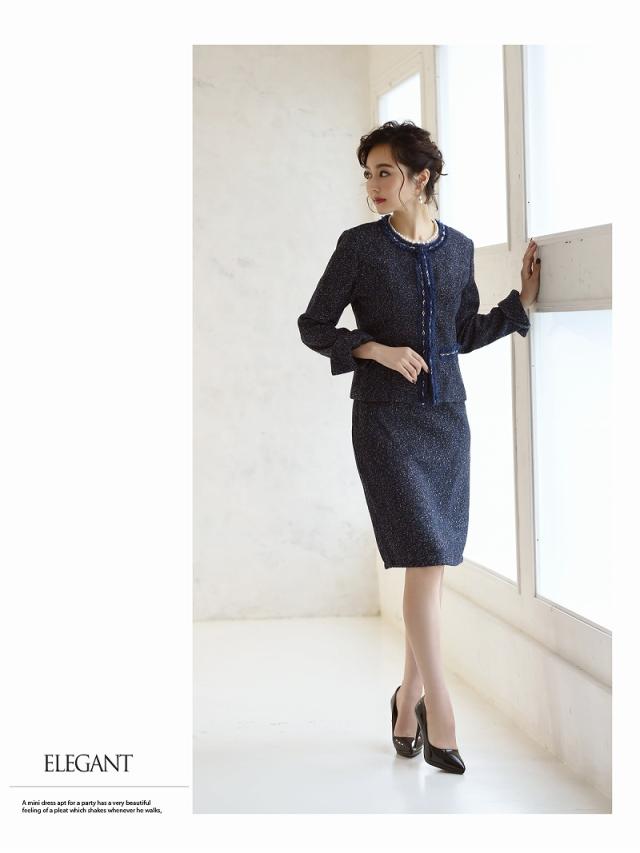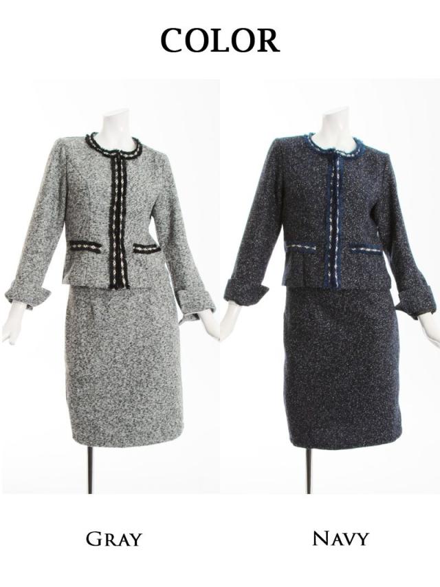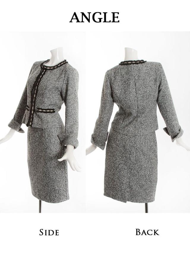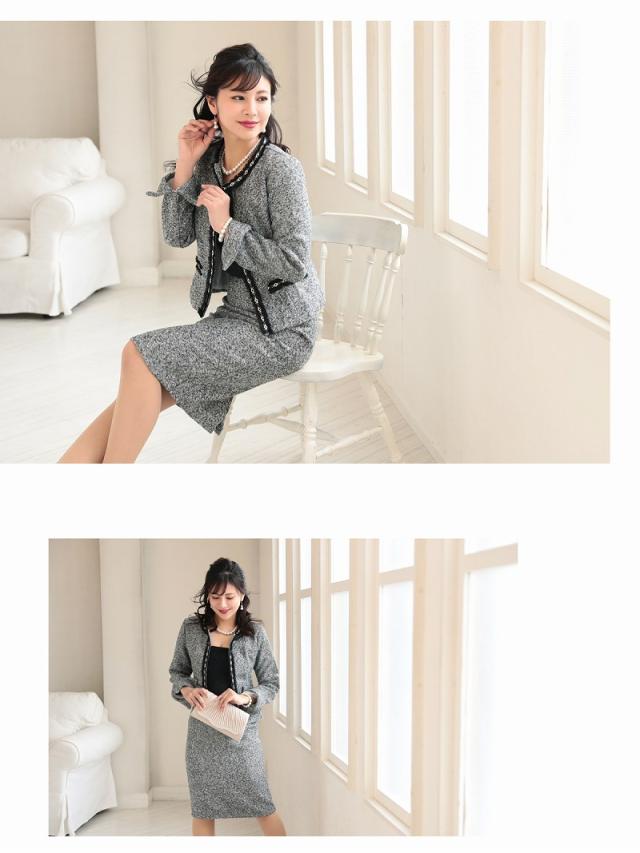 ☆女性らしい雰囲気のノーカラージャケットがセットのツイードスーツは膝丈で上品に着られるフォーマルスーツ。