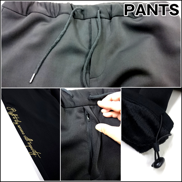 ■仕様:上着/フロント両サイドポケットあり。フルジップパンツ/両サイド及びバックにポケットあり。ドローコード付。