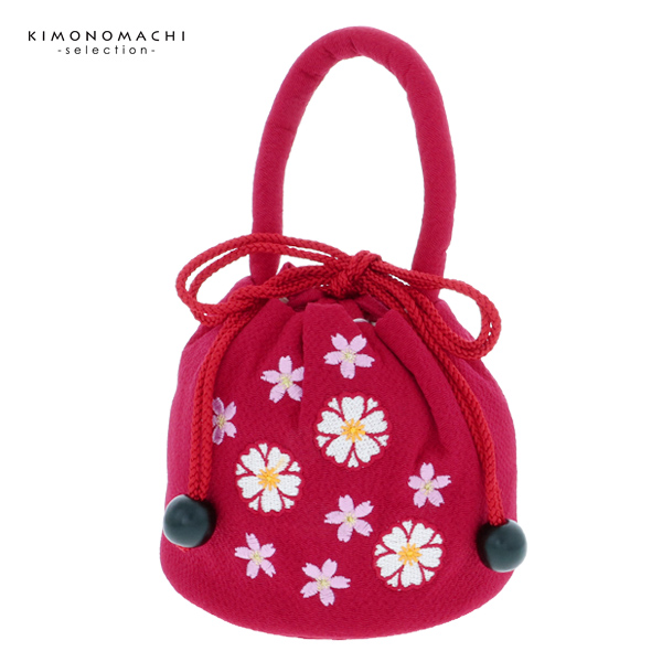 【Prices down2】七五三 巾着単品「ラズベリーレッド お花の刺繍」 桃の節句 ひな祭り 巾着バッグ 刺繍巾着