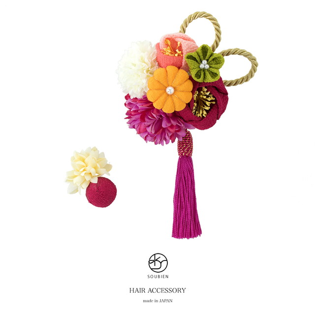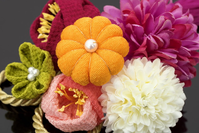 縮緬地の椿につまみ細工の桜、綿入れのふっくらした菊やピンポンマムなどの花々、金色の組紐や房飾りもあしらわれ、華やかな雰囲気です。