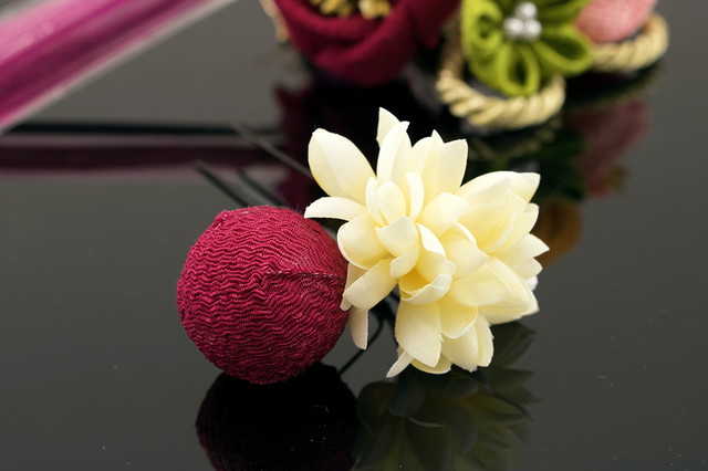 小さい髪飾りは、縮緬地の玉飾りやピンポンマムがあしらわれた可愛い髪飾りです。