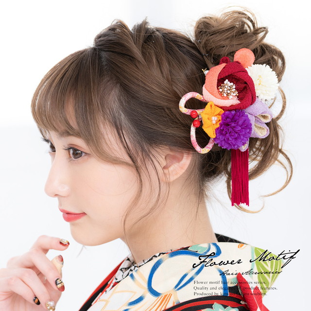 成人式 髪飾り 成人式の髪飾り 2点セット 紫 パープル 椿 桜 ピンポンマム 花 南天 丸ぐけ紐 玉飾り 縮緬 つまみ細工 コサージュ 房飾り コーム Uピン ヘアアクセ 振袖向け 卒業式向け 日本製 和装