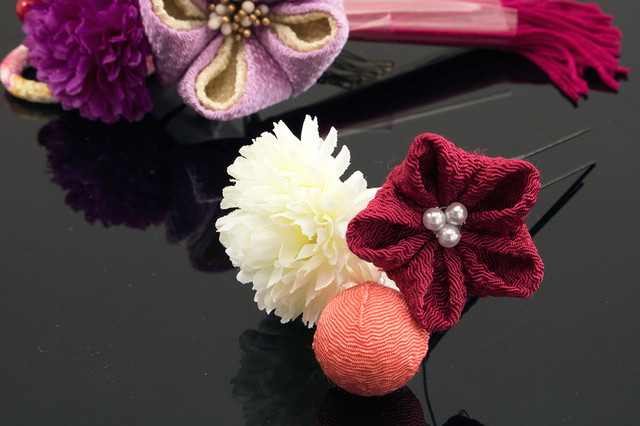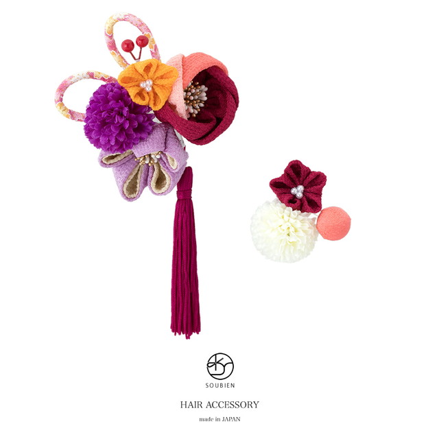 小さい髪飾りは、縮緬地のつまみ細工の桜や玉飾り、ピンポンマムがあしらわれた可愛い髪飾りです。