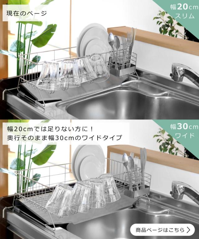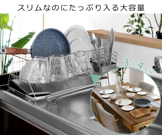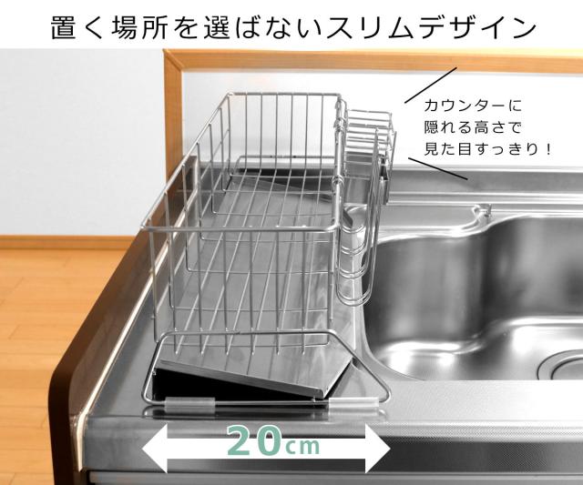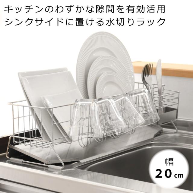 今まで水切りラックを置けなかったシンクサイドの細長いスペースにも置ける、幅約20cmのスリムな水切りラックです。
