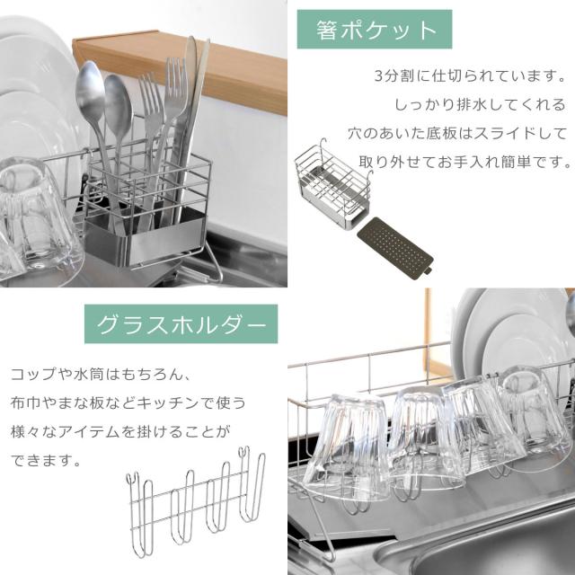 食器から落ちた水は、傾斜のついたトレーから中心に集まり、自然にシンクへ流れる構造となっており、トレー内に水が溜まらず衛生的です。付属品はすべて取り外して洗うことができます。サビや水アカに強いオールステンレス製なので長くお使いいただけます。