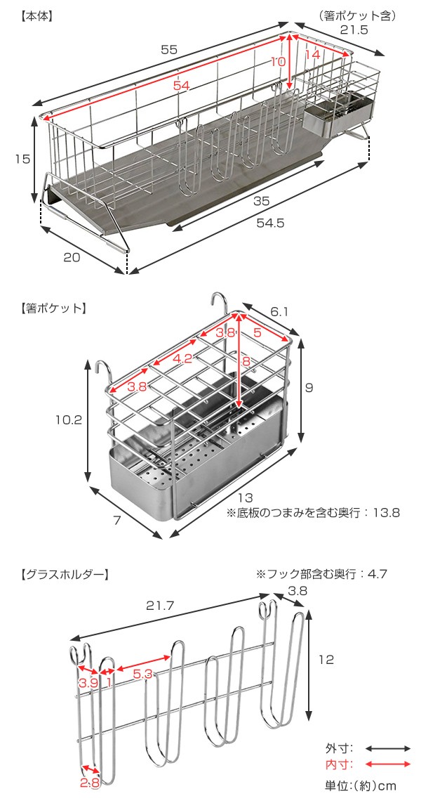 | 材質 | 本体・グラスホルダー・箸ポケット:18-8ステンレス 斜めトレー:18-0ステンレス 脚キャップ:ポリエチレン |