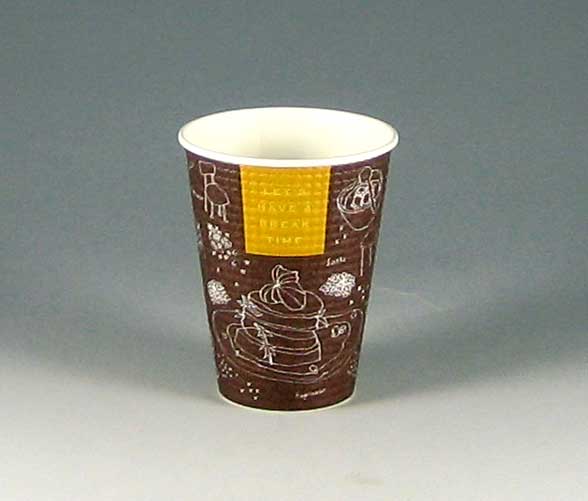 一般容器にエンボス加工した紙製のスリーブを装着することで、エアー層を形成、高い断熱性を実現しました、使用蓋はSMP-340E-Fドリンキングリッド。